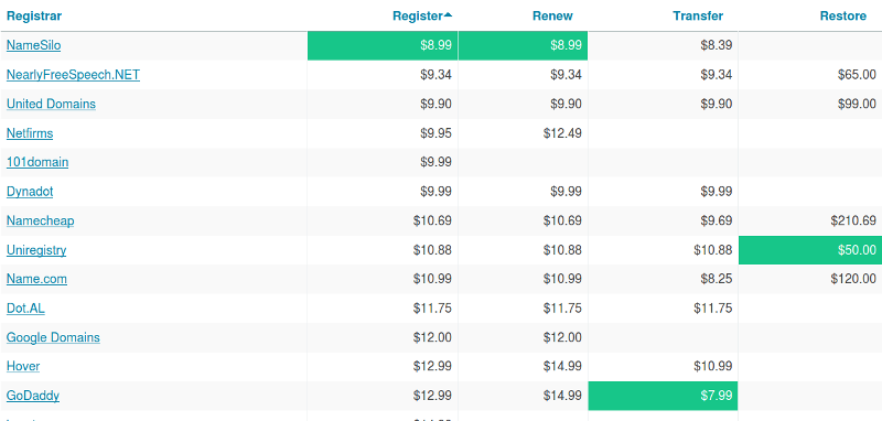Pricing for NameSilo, Uniregistry, and 101domain have been added.